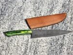 Precision-engineered for chefs, the Center-balanced 12.99″ Sujihiki Damascus-steel Chef Knife with an 8.26″ blade, wood handle, and leather sheath offers peak performance in every prep session.