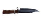 Rugged Bowie knife with 440C stainless-steel blade delivers reliable performance for versatile cutting tasks, featuring an ergonomic wood handle and protective leather sheath for unparalleled quality and durability.
